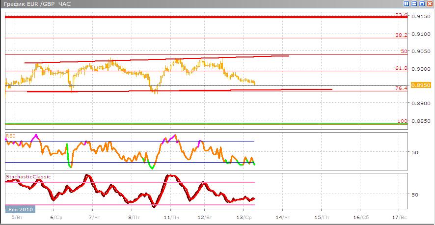 Данная пара сохранила свой торговый канал, также между 76,4% и 50% по Фибоначчи, но торговля ведется вяло. Сейчас курс подходит к нижней границе канала возможно будет отскок, что более вероятно или пробой нижней линии поддержки канала, в альтернативном варианте. Но в целом боковое движение будет доминирующим в ближайшее время в среднесрочной перспективе. Торговые индикаторы демонстрируют разнонаправленные сигналы Stohastic показывает покупку от нижней границы зоны перепроданности, а RSI весьма неопределенна в своих показаниях, то верх, то вниз, пересекая зону перепроданности.