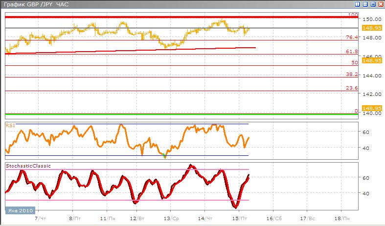 Валютная пара осталась в том же самом канале и пока не покидает его. Скорее всего движение этой пары также будет пока ограниченно этим каналом. Сейчас курс находится в середине его, но торговля проходит недалеко от линии сопротивления, но пока эта пара не смогла его пробить, возможно скоро у нее это получится. В альтернативном варианте, возможно, что пара пробьет сопротивление и уйдет выше 150,12. Классические индикаторы показывают продолжение сигнала к покупке. Stohastic показывает продолжение сигнала покупки после разворота от зоны перепроданности он пересекаясь двумя скользящими направлен наверх, RSI сейчас торгуется возле середины своих значений, но сейчас с указанием на покупку.