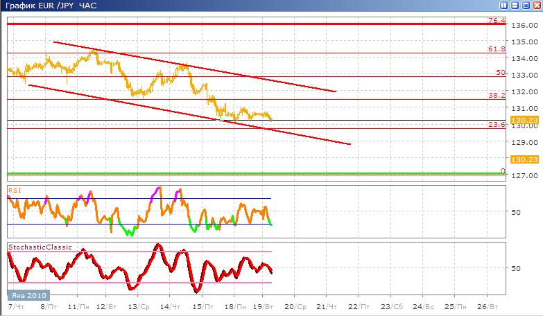 Евро-йена создает нисходящий канал движения, скорее всего этот канал какое-то время будет сохранен, и торговля будет вестись в его пределах. Сейчас валютная пара находится возле нижнего края этого канала возможен скоро отскок от линии поддержки этого канала. В альтернативном варианте возможно, что состоится пробой нижней его границы, и уход ниже уровней 23,6% по Фибоначчи. Классические индикаторы показывают продолжение сигнала к продаже Stohastic развернулся от середины своего значения пересекая свою сигнальную линию, с верху вниз, указывая сигнал на продажи, а RSI сейчас направляется вниз, уже пересекая зону перепроданности, указывая на то, что сигнал к продаже скоро закончится.