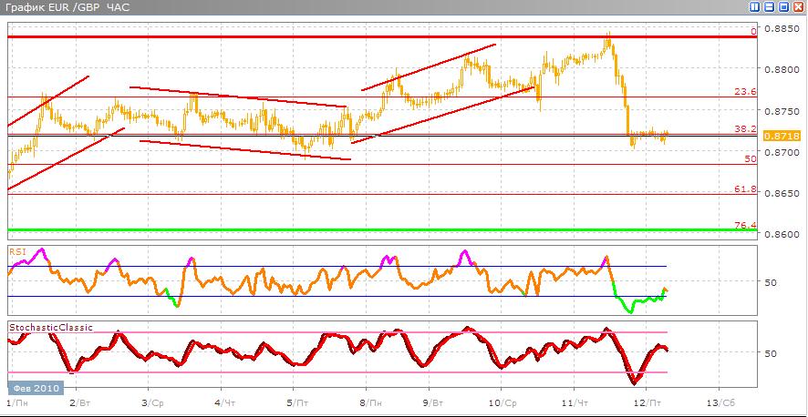 Валютная пара вновь пробивает предыдущий канал и достигает линии сопротивления, но не в силах ее пробить отправляется сразу же ниже к уровню 38,2% по Фибоначчи. Но движение вниз скорее всего продолжится и данная пара пойдет ниже 38,2% и направится к 50%, а возможно и ниже. В альтернативном варианте возможно, валютная пара пойдет снова вверх. Торговые индикаторы указывают нам, разнонаправленный сигнал, но более склонено в сторону продажи, Stohastic после пересечения направлен вниз, а RSI идет вверх из зоны перепроданности, что означает что движение вверх не сформировано.