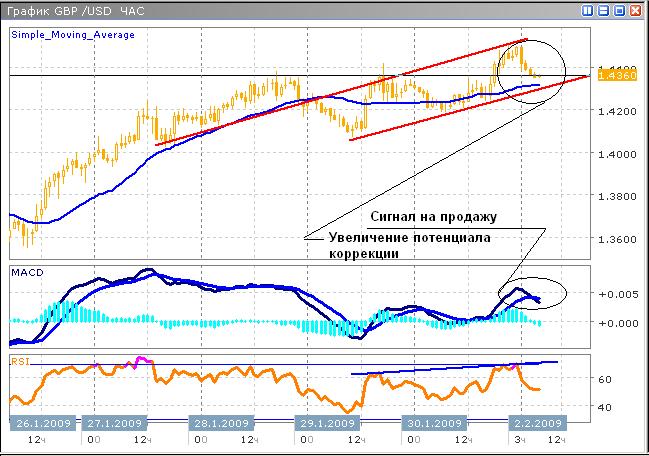 В краткосрочной перспективе ожидается снижение пары, однако бычья тенденция представляется еще достаточно сильной. Падение движущей силы тренда непропорционально отразилось на ценовом графике, в сравнении с гистограммой MACD, поэтому рекомендуем отнестись настороженно к сигналам технических индикаторов. Дивергенция графика RSI и ценового графика разрешилась только на коротких временных промежутках, однако даже этот сигнал достаточно хорошо иллюстрирует снижение оптимизма покупателей. Несмотря на достаточно долгую коррекцию цен, скользящие средние осциллятора MACD только сейчас дают сигнал на продажу, который, однако, еще не является разворотным. В данной ситуации рекомендуем перейти на более мелкие графики и дождаться разворота коррекции, в целью покупки, прогнозируемый уровень такого разворота определяется уровнем поддержки 1.4360.