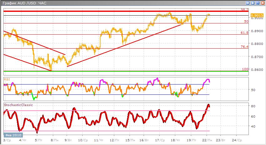 Австралийский доллар также находится в тех же пределах все пытаясь подкатить к уровню сопротивления расположенного на 38,2% по Фибоначчи, но пробить его никак не удается. Текущая ситуация указывает, что дальнейшее движение будет откатом от этого уровня вниз к 61,8% по Фибоначчи, а может и ниже. Стандартные индикаторы торговли указывают на сигнал продаже, Stohastic после выхода из зоны перекупленности направлен вниз, и RSI также находясь в зоне перекупленности направлен вниз , что усиливает сигнал.