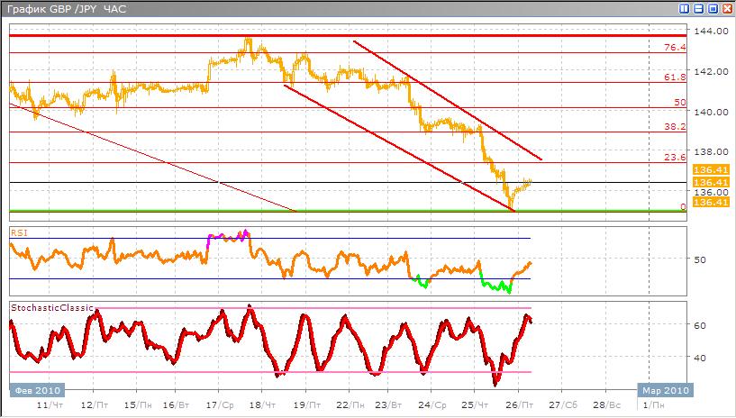 Торговая валютная пара собралась силами и пробивает уровень поддержки и сейчас торговля ведется на уровнях 136,40, после того как валюта совершила отскок от уровня поддержки. Скорее всего дальнейшее движение будет проходить также в отскоке, но после тренд нисходящий может продолжится. В альтернативном варианте возможно, что пробой текущего сопротивления будет в ближайшее время. Классические индикаторы указывают на начало сигнала к продаже, Stohastic почти дошел до зон перекупленности и совершает разворот вниз и пересечение скользящих средних вот вот произойдет, а RSI выходит из зоны перепроданности и направлен вверх.