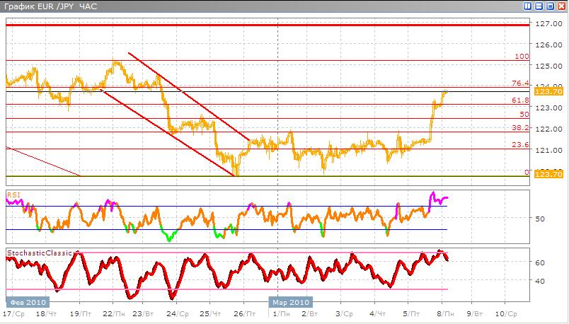 Пара евро-йена совершает отскок от текущего уровня поддержки в сторону возрастания и сейчас почти достигает уровня 76,4% по Фибоначчи скорее всего, скоро это восходящее движение выдохнется и отойдет на уровни ниже, т.е. 61,8% и 50%. В альтернативном варианте торговли рост не прекратится и валютная пара продолжит возрастание к максимумам прошлого месяца. Классические индикаторы указывают нам на сигнал к продаже. Stohastic пересекается скользящими средними недалеко от зоны перекупленности сверху вниз, а RSI после нескольких зигзаговых движений также направляется вниз.