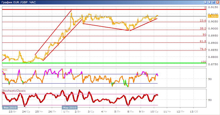 Пара евро-йена после стремительного роста к уровню в 76,4% по Фибоначчи совершает отскок к 38,2% и сейчас торгуется возле уровня 50%. Скорее всего отскок был временным и дальнейший рост пары продолжится к 61,8% по Фибоначчи и выше. В альтернативном варианте возможно, что все же движение вниз окажется сильнее и торговая пара упадет к 23,6% и даже ниже этого уровня. Классические индикаторы указывают нам на сигнал к покупке. Stohastic пересекается скользящими средними снизу вверх, а RSI после нескольких зигзаговых движений также направляется вверх.