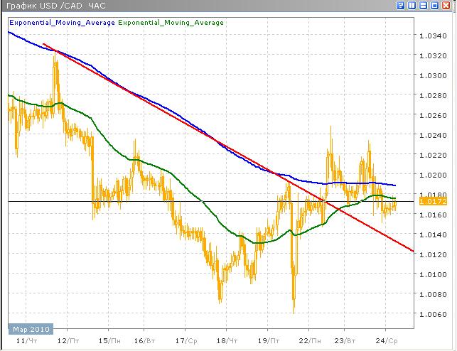 Валютная пара usd/cad в начале марта показала снижение, во время которого был обновлен годовой минимум на уровне 1.0250. Затем состоялось снижение в район 1.005. Далее цены понизиться не смогли, вернувшись назад к уровню пробитого минимума, превратившегося из поддержки в сопротивление. За время падения на часовых графиках образовался четкий понижательный наклонный канал. Верхняя граница этого канала совпадает со скользящей средней с периодом 200. В настоящее время цены смогли пробить снизу верхнюю границу наклонного понижательного канала, но рост после пробития был недолгим. Препятствием стал сильный уровень сопротивления 1.0250. Пройти его сходу не получилось и в среднесрочной перспективе вряд ли получится. Поэтому в ближайшее время можно ожидать продолжения падения до уровня 1.000 либо вялого бокового движения на текущих уровнях.