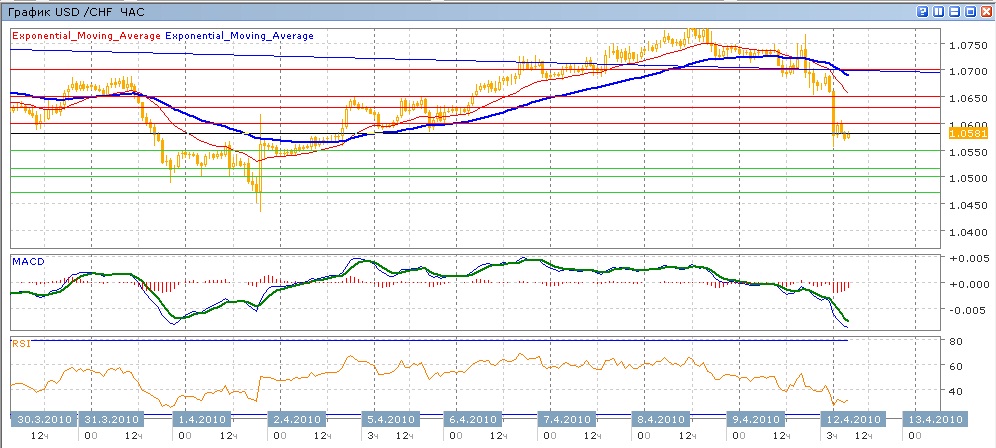 После того, как пара 8 апреля не смогла достичь уровня 1.0800, она начала снижаться. Это снижение усилилось 9 апреля и продолжилось так же усиливаясь в ходе сегодяншних торгов, в ходе которых пара сумела преодолеть уровень 1.0600. Слабые попытки выйти снова выше этого уровня не увенчались успехом. Средние скользящие ЕМА21 и ЕМА55 пересеклись вниз, индикаторы MACD и RSI ушли глубоко вниз под свои центральные линии и, похоже, пока замедлили свое снижение. Цель продолжающегося движения вниз на сегодня — достижение отметки 1.0500 через преодоление поддержек на 1.0550 и 1.0515, после чего возможно движение к 1.0470, но маловероятно. Цель вверх — возврат и закрепление выше 1.0600 с последующим движением к 1.0630 и 1.0650.