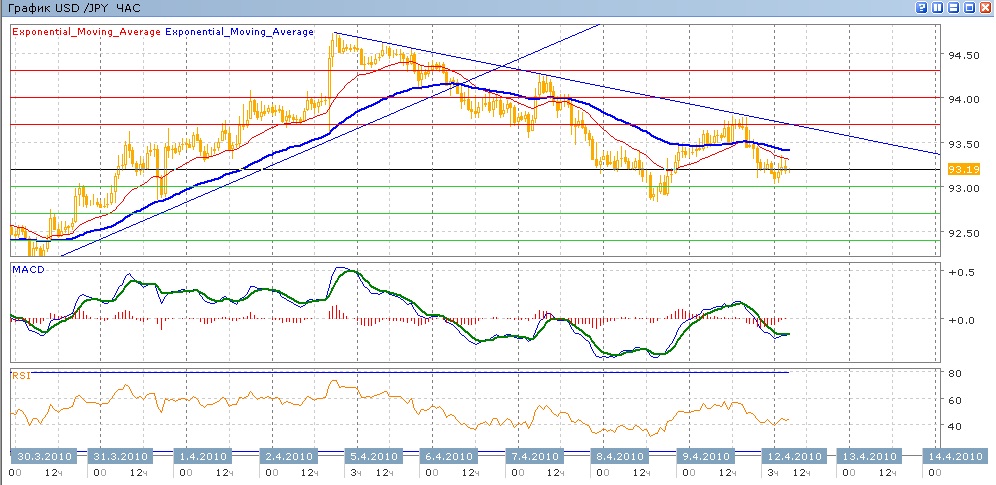 Нисходящее движение, начатое 2 апреля, в общем пока еще продолжается. 8 апреля пара ненадолго ушли ниже уровня 93.00, затем начала расти. Этот рост продолжился и 9 апреля, но преодолеть нисходящее сопротивление у пары не хватило сил. И она откатилась вниз снова к уровню 93.00. Сегодняшние торги проходят с небольшим повышением, средние скользящие ЕМА21 и ЕМА55 по-прежнему направлены вниз, индикаторы MACD и RSI также говорят о доминировании нисходящего движения — они находятся под своимим центральными линиями, но несколько стабилизировались.Продолжение нисходящего движения сегодня нацелено на достижение и тестирование уровня 93.00, затем проверка на прочность подержки на 92.70 и далее движение к 92.40. Цель вверх — преодоление сопротивления на 93.70-93.80 (на пути к которому пару встретит также сопротивление нисходящих ЕМА21 и ЕМА55 и нисходящее сопротивление), далее уровень 94.00, выход выше которого к 94.30.