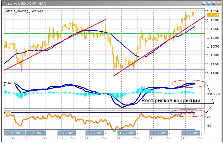 После активной медвежьей коррекции, пара незначительно ускорила рост, однако откат уже близок. С преодолением каждого нового уровня сопротивления, оптимизм покупателей спадает, при этом с каждым часом, желающих купить становится меньше. Занимать короткие позиции пока рано, и достаточно рискованно, поскольку в долгосрочной перспективе позиции франка против доллара весьма шатки. Разворот тенденции будет носить краткосрочный характер, поэтому инвестиционный горизонт нужно выбирать соответствующий. Гистограмма осциллятора MACD приближается к нулевой оси, в то время как еще скользящие начинают формировать медвежий сигнал. График индикатора RSI тестирует на прочность зону перекупленности, что готовит нас к коррекции.