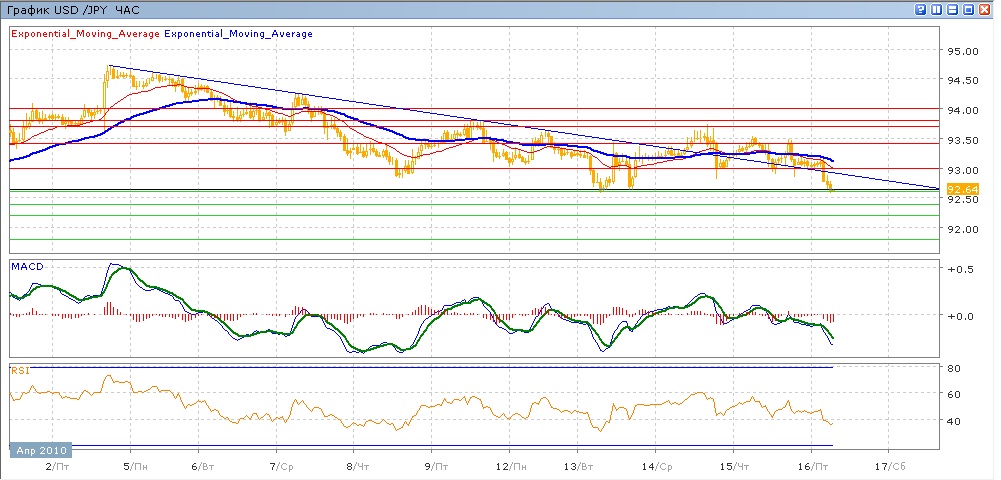 Торги в среду и четверг характеризовались снижением пары, при этом сумела преодолеть нисходящее сопротивление и снижалась, большей частью двигаясь над этим сопротивлением. Поддержка уровня 93.00 сдерживала продавцов. Тем не менее, в ходе сегодняшних торгов уровень 93.00 оказался преодолен и пара снова оказалась ниже нисходящего сопротивления. Средние скользязщие ЕМА21 и ЕМА55снова начала двигаться вниз, индиккаторы MACD и RSI со среды снижаются и сейчас уже находятся ниже своих центарльных линий. Цель вниз на сегодня — преодоление поддержки 13 апреля на 92.60, затем последовательное движеие вниз через 92.40, 92.20 к уровню 92.00. движение вверх будет стараться протестировать ставшйи теперь сопротивлением уровень 93.00, далее 93.40 (с сопротивлением от ЕМА21 и ЕМА55).