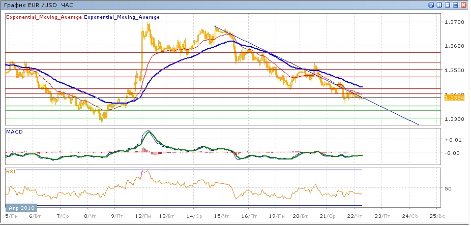 С 14 апреля пара продолжает снижаться. Во вторник была предпринята попытка тестирования вверх уровня 1.3500 с закреплением выше нисходящего сопротивления, что не удалось — пара к концу сессии снова откатилась ниже сопротивления, вдоль которого снижалась на протяжении среды и снижается в ходе сегодяншних торгов, торгуясь ниже уровня 1.3400. Дополнительное сопротивление также пара испытывала от нисходящей ЕМА21. Средние скользящие ЕМА21и ЕМА55 уверенно направлены вниз, индикаторы MACD и RSI со вторника находятся ниже своих центральных линий. Цель сегодня вниз — это продолжение движения к уровню 1.3350 с дальнейшим движением к 1.3300 (и вероятным обновлением минимумов 8 апреля на 1.3281). Движение вверх будет пытаться тестировать уровень 1.3400 (с дополнительным сопротивлением от ЕМА21), далее 1.3420 (с сопротивлением от ЕМА55), затем 1.3470.