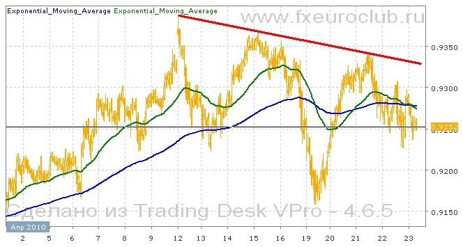 Валютная пара aud/usd находится в состоянии широкого волатильного бокового тренда. Но с конца марта на часовых графиках установился относительно устойчивый восходящий тренд. За это время котировки смогли подняться с уровня 0.900 до 0.9380. Сейчас на графиках формируется фигура продолжения тренда "флаг". После пробоя вверх уровня 0.9350 рост может ускориться. Но поведение скользящих средних сейчас говорит не в пользу роста котировок. В настоящее время быстрая скользящая средняя пересекла сверу вниз медленную, но обе движутся практически горизонтально. Поэтому скорее всего продолжится боковой канал без определенного направления движения. В данных условиях повышение котировок валютной пары aud/usd вряд ли может быть продолжено. Хотя целью роста продолжает оставаться уровень 0.9500