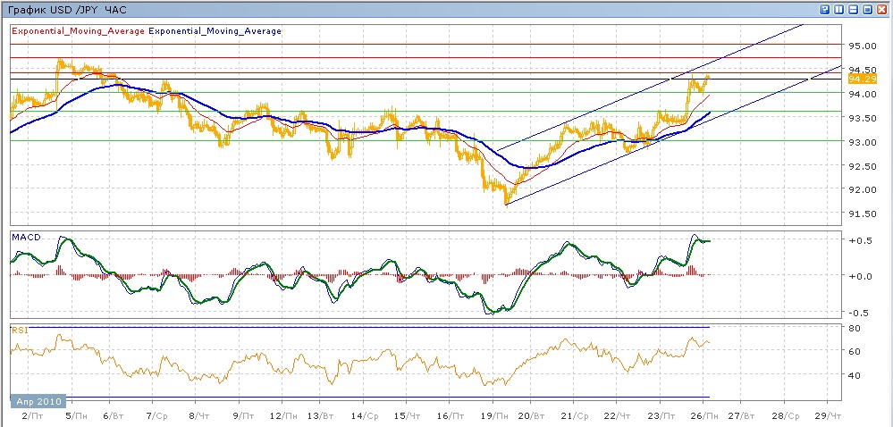 Пара продолжает двигаться в пределах восходящего канала, начатого 19 апреля. В пятницу она добралась до двухнедельных максимумов на уровне 94.40 и после небольшого снижения в конце пятницы снова торгуется на уровне 94.40 с начала уже сегодняшних торгов. Пара движется сейчас в верхней части канала, средние скользящие ЕМА21 и ЕМА55 направлены вверх, индикаторы MACD и RSI находятся над своими центральными линиями и пока держатся на уровнях пятницы. Продолжение движения вверх имеет целью преодоление уровня 94.40, затем дальнейшее движение к 94.72 (максимум 2 апреля) и далее тестирование отметки 95.00. Цель вниз — уровень 94.00 (с поддеркой от ЕМА21), далее 93.60 (с поддержкой от восходящей ЕМА55 и нижнейграницы восходящего канала), если это преодолеваися — то далее уровень 93.00.
