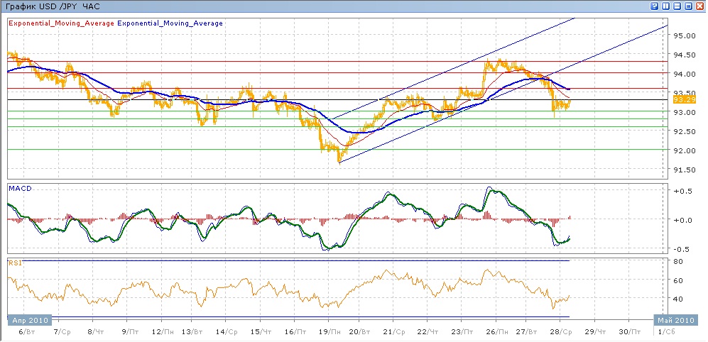 Торги понедельника прошли в боковом движении в диапазоне 94.00-94.30, из которого пара вышла вниз вчера на новостях по Греции, добравшись до уровня 93.00. сегодня пара торгуется пока без изменений к открытию, при этом пару раз пыталась преодолеть поддержку на 93.00. Средние скользящие ЕМА21 и ЕМА55 пересеклись вниз, индикаторы MACD и RSI находятся под своими центральными линиями ипоказывают слабый рост. Ближайшие цели вниз на сегодня — 93.00, 92.80 (уровень минимумов вчера и 22 апреля), 92.60, если хватит силы у продавцов — то возможно движение к 92.00. Цель вверх — 93.60 (для чего потребуется преодолеть сопротивление в виде нисходящих ЕМА21 и ЕМА55), далее 94.00. при дальнейшем движении пара может встретить сопротивление в виде нижней границы восходящего канала.