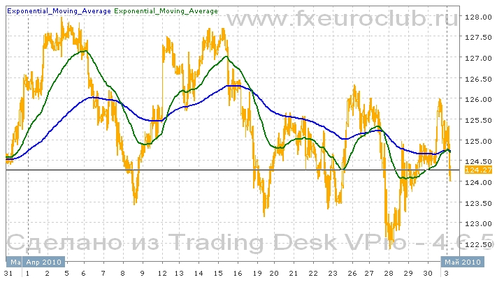 Валютная пара eur/jpy в последнее время находится в широком боковом коридоре в диапазоне 122.00-127.80. В данный момент котировки находятся практически в середине указанного коридора. Поэтому дальнейшее движение определить практически невозможно. Наиболее вероятным видится сценарий ускорения падения после пробития вниз уровня 122,00. Хотя, комбинация скользящих средних с периодами 55 и 200 сейчас находится в положении бокового тренда, поскольку быстрая линия пересекла снизу вверхз медленную. Но обе лежат практически горизонтально. В данных условиях поведение котировок валютной пары eur/jpy может остаться хаотическим в границах указанного канала.