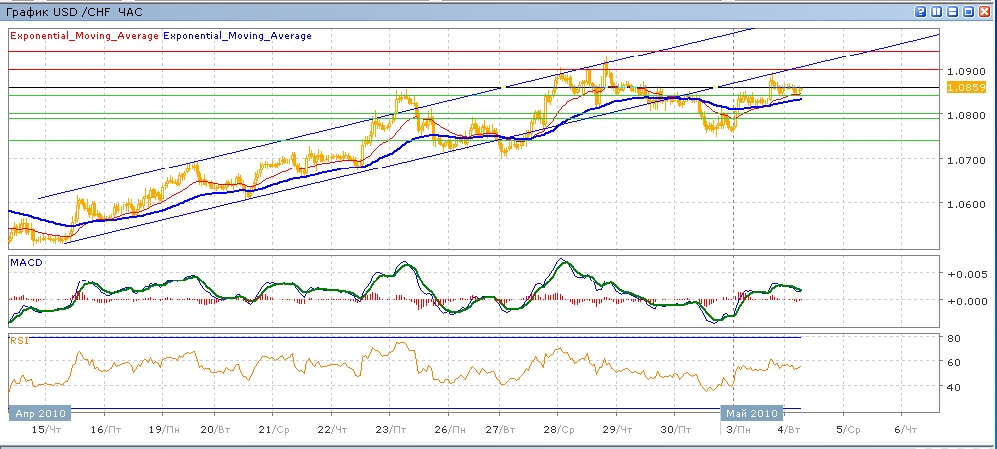 оттолкнувшись от поддержки на 1.0760 30 апреля, пара вчера практически добралась до уровня 1.0900. Силы закрепиться на этом уровне не хватило и пара откатилась к достатоно сильной поддержке на 1.0840, которую с начала сегодняшних торгов она снова тестирует. Средние скользящие пересеклись вверх, индикаторы MACD и RSI находятся над своими центарльными линиями и снижаются. Целями вниз сегодня станут 1.0840 (с поддержкой паре от ЕМА21 и ЕМА55) и далее уровень 1.0800. Целью вверх является уровень 1.0900 (с сопротивлением от нижней границы канала), далее 1.0940.