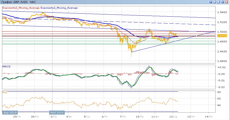 10 мая мы наблюдали попытку преодоления вверх уровня 1.5000, это не удалось, пару сдержал сопротивление на этом уровне и нижняя граница канала, из которого пара вышла 6 мая.после этого оставшийся понедельник и большую часть вторника пара снижалась, сумев кратковременно опуститься ниже 1.4800, после чего опять протестировала 1.5000. сегодняшние торги проходят с небольшим снижением пары, в ходе которого она пытается преодолеть уровень 1.4900, который вместе со средними скользящими ЕМА21 и ЕМА55 оказывают ей поддержку. С некоторыми допущениями можно говорить о формировании на графике сходящегося треугольника с верхней границей в виде нижней границы нисходящего канала и нижней границей в виде восходящей поддержки, причем с боьшей активностью покупателей. Сегодня движение вверх будет иметь целью выйти выше 1.5000 с споротивлением от верхней границы треугольника, при движении вниз пара будет стараться отрваться от 1.4900 к 1.4850 и далее к 1.4800 (с поддержкой паре от восходящейй поддержки и средних ЕМА21 и ЕМА55).