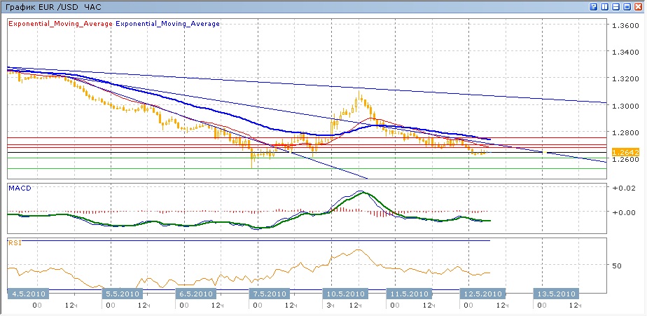 Кратковрменный всплеск энтузиазма, наблюдавшегося 10 мая, завершился очень быстро — пара буквально на пару часов выросла выше 1.3000, после чего начала откатываться вниз, отыграв практически весь гэп, с которым она открылась в понедельник. Во вторник продолжалось медленное сползание вниз, с попытками уйти ниже 1.2700, что сегодня паре и удалось. Сейчас после некоторго снижения пара стабилизировалась. Между тем, средние скользящие ЕМА21и ЕМА55 продолжают свое снижение, индикаторы MACD и RSI медленно снижаются под своими центральными линиями. Цели вниз на сегодня — уровень 1.2600, после которого прямая дорога вниз к минимумам 7 мая на 12518. Движение вверх направится к 1.2680-1.2700 (с дополнительным сопротивлением от средней ЕМА21), далее - 1.2750 с более серьезным сопротивлением от ЕМА55.