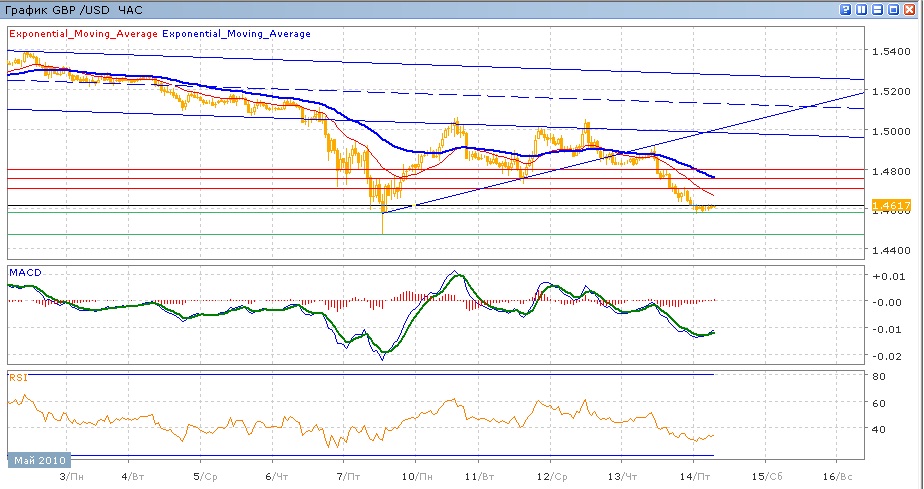 Уровень 1.5000 , протестированный лишь единожды 12 мая, сдержал попытку покупателей, после чего пара начала снижение и преодолела восходящую поддержку, начатую 7 мая. Вчера, после слабого роста под этой поддержкой (ставшей сопротивлением), пара резко ушла вниз на 300 пунктов, добравшись тем самым до минимумов 7 мая на уровне 1.4600. В ходе сегодняшних торгов пара торгуется весьма вяло над самым уровнем 1.4600. Средние скользящие ушли резко вниз, индикаторы MACD и RSI также ушли вниз под свои центарльные линиии сейчас немного растут, отмечая замедление нисходящего движения. Цель вниз на сегодня — это преодоление уровня 1.4500 и возможное обновление минимуа 7мая на уровне 1.4471. Цель вверх — уровень 1.4700 (с сопротивлением ввиде ЕМА21), далее 1. 4750 и движение к 1.4800 (с сопротивлением от средней ЕМА55).