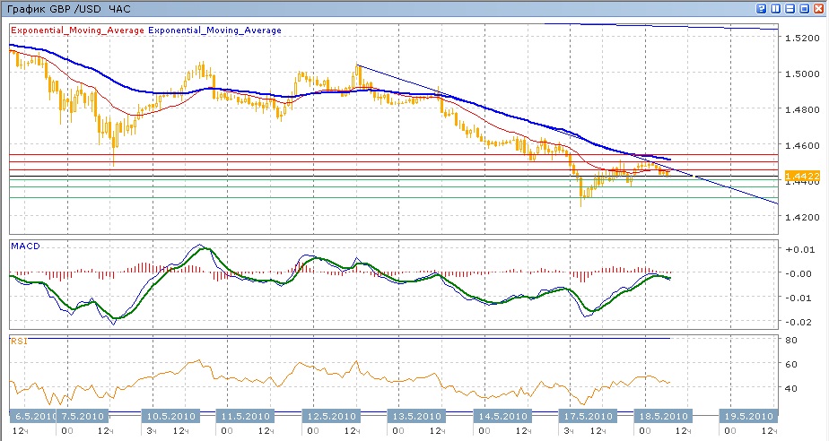Снижение, начатое 12 мая, продолжается. В пятницу пара снижалась, испытывая сопротивление сос тороны нисходящей ЕМА21, в сакмом начале торгов вчера пара резко ушла вниз на более чем 200 пунктов, показав минимумы самого конца марта — начала апреля на 1.4300. Затем в теение сессии пара отыграла практически полностью все снижение. С начаал сегодняшних торгов пара уверенно снижается, преодолев уровень 1.4450. Средние скользящие ЕМА21 и ЕМА55 снижаются, индикаторы MACD и RSI находятся под своими центральными линиями и снова начинают снижаться. Цель вниз на сегодня — уровень 1.4400, далее поддержка на 1.4360 и затем движение к 1.4300 с возможностью обновления вчерашнего минимума. Цель вверх — 1.4500 (для чего придется преодолеть сопротивление ниходящей ЕМА21, уровня 1.4450 и нисходящего сопротивления), далее 1.4550