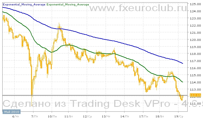 Валютная пара eur/jpy на прошлой неделе упала с уровня 125,5 до уровня 110,75. Падение было вызвано паникой вокруг бюджетной задолженности в Европе. Затем Евросоюз совместно МВФ принял решение по поддержке проблемных стран, что снизило риски в финансовой системе и рынки снова принялись расти. Во время первого всплеска котировок валютная пара eur/jpy достигла уровня 50% коррекции от предыдущего падения и снова пошла вниз. Сейчас котировки понемногу снижаются, закрепившись под линией быстрой скользящей средней с периодом 55, которая снижается и движется параллельно линии медленной скользящей средней с периодом 200. А так как быстрая средняя сейчас находится под медленной, то формально присутствует понижательный тренд. Если уровень поддержки в районе 110,50 не устоит, то следующей целью снижения может стать район 100,00.
