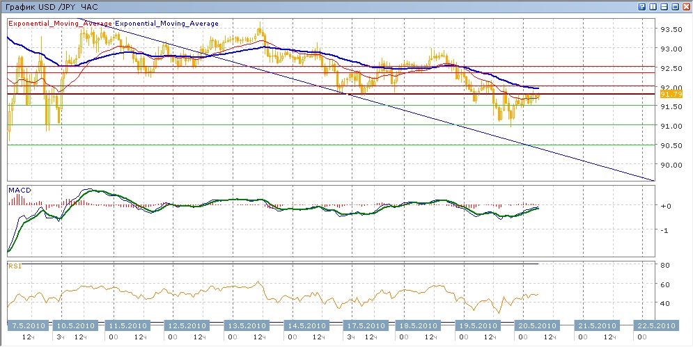 После небольшого роста 18 мая пара, набравшись сил, сумела вчера преодолеть поддержку на 91.80-92.00. последовавшее далее снижение добралось до минимумов, показанных 7 мая, на уровне 91.00. но задержаться на этом уровне ей не удалось и пара подросла к отметке 91.50. с начала нынешних торгов пара торгуется в укзком коридоре 91.50-91.80. Средние скользящие ЕМА21 и ЕМА55 меделнно спускаются вниз, индикаторы MACD и RSI находятся под своими центральными линиями и показывают начавшийся замедляться рост. Продолжение движения вниз нацелено сегодня на уровень 91.00 через преодоление поддержки на 91.50 с возможным движением к 90.50. Цель вверх - преодоление коридора 91.80-92.00 (с сопротивлением от ЕМА55) , далее 92.35 и 92.50.