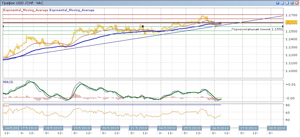 Восходящий тренд пары вновь продолжается. 24 мая пара вышла из коридора 1.1450-1.1590 и ко второй половине вторника достигла уровня 1.1700, после чего последовал откат к 1.1550. с начала сегодяншних торгов пара растет, получая помощь от восходящей поддержки. Средние скользящие ЕМА21 и ЕМА55 продолжают свой рост, хотя сейчас начали замедляться. Индикаторы MACD и RSI находятся в районе своих центральных линий и показывают слабый рост. Продолжение восходящго движения нацелено на отрыв от 1.1600 и движение к 1.1650 и далее на повторение вчерашнего максимума на 1.1700. Цель вниз — пробить 1.1600 (при этом пара получит поддержку от ЕМА21 и ЕМА55), далее 1.1550 и 1.1500.