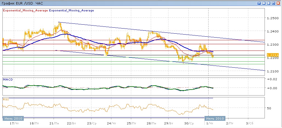 Пара с 21 июня постепенно снижается. Во вторник пара снизилась до уровня 1.2170, ниже которого не смогла закрепиться, получив поддержку на уровне и от нижней границы нисходящего канала. Среда стала противоположным днем для пары — она вернулась одномоментно к уровню вторника на 1,2300, но затем немного снизилась, в итоге закрывшись выше уровня вторника. Сегодяншние торги проходят вновь с понижением, пара тестирует уровень поддержки 1.2200. Средние скользящие ЕМА21 и ЕМА55 продолжают снижаться, индикаторы MACD и RSI несколько снизились под своими центральными линиями. Нас егодня целью вниз станет уровень 1.2200, далее поддержка на 1.2170 и затем минимум вторника на 1.2150. Целью вверх будет 1.2250 (с сопротивлением от нисходящих ЕМА21 и ЕМА55), далее 1.2300.