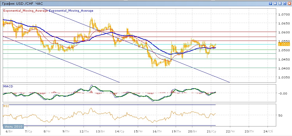 с 16 июля наблюдается небольшая коррекция вверх, которая пока не в состоянии преодолеть сопротивление на 1.0550. понедельник и вторник пара двигалась в пределах 1.0450-1.0550 и сегодняшние торги проходят также в этом диапазоне. После снижения к отметке 1.0500 в начале сессии пара восстановилась и сейчас торгуется без изменений к цене открытия. Средние скользящие ЕМА21 и ЕМА55 слабо растут, индикаторы MACD и RSI также указывают на слабый рост — они едва находятся над своими центральными линиями. Сегодня вверх мы имеем целями увровни 1.0550, далее 1.0570 и тестирование 1.0600. Движение вниз направлено на 1.0500 (с поддеркжойт от ЕМА21 и ЕМА55), далее 1.0480 и 1.0450.