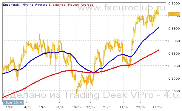 Валютная пара aud/usd к настоящему моменту находится на максимальных значениях за последние недели. Серьезных коррекций к росту пока еще не было, но, скорее всего, этот рост будет продолжен. Недавно был подтвержден важный уровень поддержки в районе 0,8850. Цены попытались протестировать этот уровень с верхней стороны и он устоял. Поэтому сейчас дальнейшей целью движения может стать возврат в район 0,9000. Согласно расположению скользящих средних сейчас началась восходящая фаза движения котировок. Поскольку быстрая скользящая средняя с периодом 55 все еще находится выше медленной скользящей средней с периодом 200. И обе средние сейчас упорно продолжают повышаться. Следовательно рост в этой ситуации более вероятен.