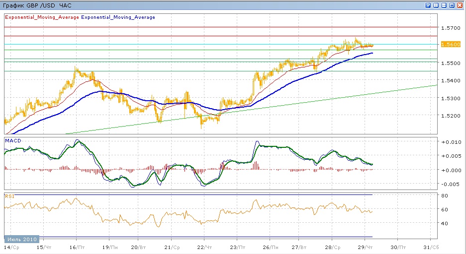 рост пары продолжается. Во вторник после снижения к 1.5450 пара вновь начала расти, в результате чего к вчерашнему вечеру добралась до отметки 1.5650, показав очередной максимум. В ходе сегодняшнией торговли пара колеблется около уровня 1.5600. Средние скользящие ЕМА21 и ЕМА55 продолжают увренный рост, индикаторы MACD и RSI при этом постепенно с 23 июля снижаются, находясь пока над своими центральными линиями, что, вероятно, указывает на ослабление восходящего движения. Целями вверх на сегодня являются рост к 1.5650 и возможное продвижение к 1.5700, вниз пару ждет движение от 1.5600 к 1.5570, затем к 1.5520 и тестирование 1.5500.