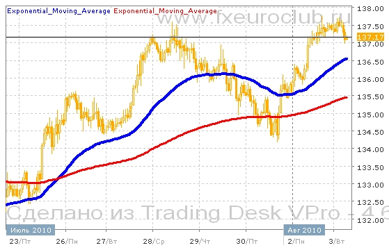 Валютная пара gbp/jpy продолжает колебаться на достигнутых ранее уровнях, хотя появляется все больше признаков продолжения восходящего тренда. После достижения максимума в районе 137,20 цены закрепились вблизи этого уровня. Но дальнейшего движения вверх пока не последовало. В данный момент цены консолидируются примерно в верхней части диапазона вблизи отметки 137,00. При этом продолжение тренда будет выяснено после выхода котировок за пределы сложившегося диапазона колебаний 134,20-137,20. Комбинация скользящих средних с периодами 55 и 200 сейчас находится в положении восходящего тренда, поскольку быстрая линия пересекла снизу вверх медленную. И обе средние сейчас движутся вверх, поэтому не исключено, что повышение котировок может ускориться. Понижение котировок валютной пары gbp/jpy выглядит менее вероятным пока не пробит вниз уровень поддержки в районе 134,20.
