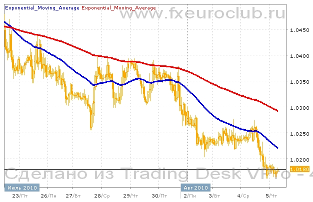 Валютная пара usd/cad последнее время демонстрировала постепенное понижение котировок. Движение вниз происходило не быстро, но уверенно. Локальные минимумы постоянно обновлялись. Сейчас котировки находятся в нижней торгового диапазона последнего месяца, но дальнейшая динамика пока не понятна. Если уровень поддержки в районе 1,0150 не устоит, то следующей целью понижения станет район 1,0000. Для возобновления роста необходимо удержаться выше уровня поддержки в районе 1,0150. Комбинация скользящих средних подтверждает сценарий понижения. Быстрая скользящая средняя с периодом 55 находится ниже медленной с периодом 200, и обе средние сейчас понижаются. Поэтому в ближайшее время понижение котировок может продолжиться. Рассчитывать на рост в таких условиях нецелесообразно, пока не произойдет обратного пересечения скользящих средних.