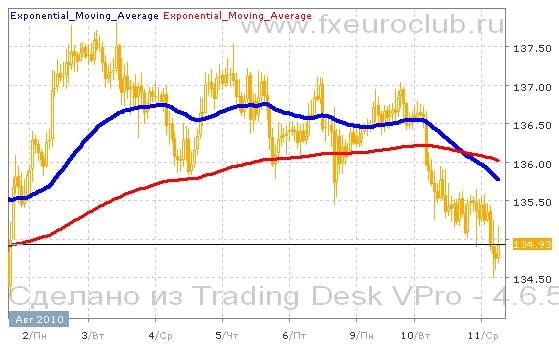 Валютная пара gbp/jpy не смогла продолжить повышение, начатое в середине прошлого месяца и в данный момент находится в в средней части диапазона, образованного максимальными и минимальными значениями последних недель. На часовых графиках образовалась разворотная фигура технического анализа "двойная вершина", которая может служить фигурой смены тенденци. Если уровень поддержки в районе 134,00 будет пробит, то целью понижения станет район 131,50. В противном случае котировки начнут повышаться и в итоге смогут преодолеть максимальный уровень в районе 137,80. Технические индикаторы пока говорят о возможном начале понижения. Комбинация скользящих средних, в которой быстрая с периодом 55 находится ниже медленной средней с периодом 200, говорит о начале нисходящего тренда. Повышение котировок в данных условиях маловероятно.