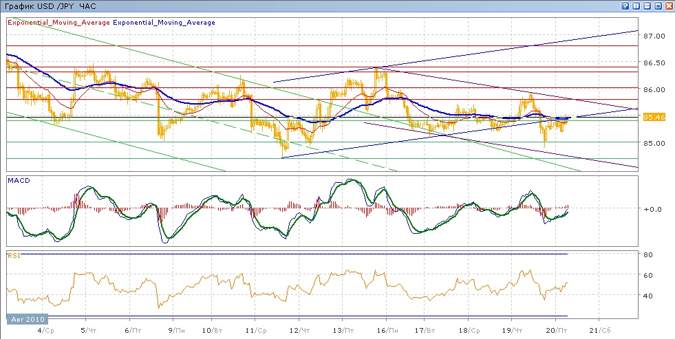 Восходящее движение, начатое 11 августа, прервалось. Со вторника пара медленно росла, торгуясь около нижней границы канала, но вчера в ходе усилившегося движения вниз она преодолела границу канала и в ходе торгов показала уровни ниже 85.00. последовавшее восстановление и чегодняшяя торговля уперлись в уровень 85.40. Средние скользящие ЕМА21 и ЕМА55 медлено снижаются, индикаторы MACD и RSI после небольшого роста снова оказались ниже своих центральных линий. Основная цель на сегодня вниз — это движение к 85.00 (с преодолением поддержки на 85.40), после чего возможно повторное продвижение к вчерашнему минимуму на 84.89. Цели вверх — 85.80 (с сопротивлением от ЕМА21, ЕМА55 и нижней границы канала), далее тестирование 86.00