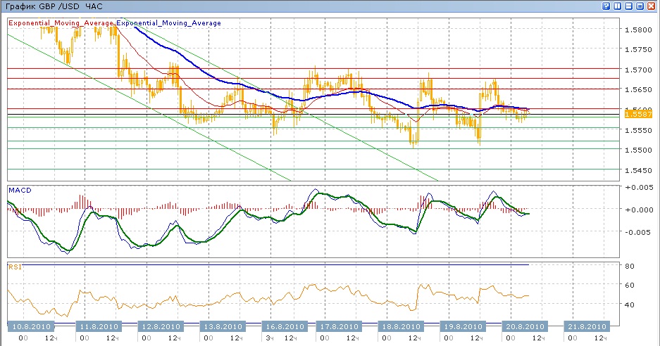 нисходящий тренд явно замедлился и в общем пара с 12 августа движется в коридоре 1.5500-1.5700. за последние 2 дня пара дважды добиралась до 1.5500, но преодолеть этот уровень у продавцов сил не хватало, центром торговли является уровень 1.5600, вокруг которого пара ходит со среды. Средние скользящие ЕМА55 и ЕМА21 замедлились в своем снижении, индикаторы MACD и RSI находятся сейчас под своими центральными линиями, но медленно со среды растут. Цели движения вниз на сегодня — преодоление 1.5570 -1.5580 и 1.5550 с продолжением движения к 1.5500. Движение вверх направлено будет на тестирование уровня 1.5600, далее 1.5650 и 1.5675.