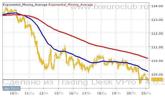 Валютная пара eur/jpy находится в состоянии падающего тренда. Причем сейчас котировки находятся на минимальных уровнях в районе 119,50. На часовых графиках образовался уровень поддержки в районе 108,50, от которого котировки уже один раз отталкивались вверх. Если в этот раз уровень будет пробит вниз, то падение может ускориться. При этом поведение технических индикаторов в данный момент больше говорит о продолжении нисходящего тренда. Поскольку быстрая скользящая средняя с периодом 55 находится ниже медленной скользящей средней с периодом 200. При этом быстрая средняя движется наклонно вниз и параллельно медленной средней средней. Поэтому в данной ситуации продолжение падения становится делом времени. Целью снижения является уровень 105,00.