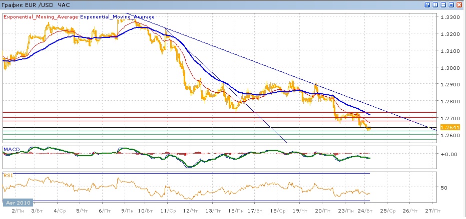 пятница и понедельник прошли под контролем продавцов, которые за эти два торговых дня опустили пару на 200 пунктов вниз, в результате чего пара добралась до почти полуторамесячных минимумов. сегодняшние торги проходят с небольшим снижением и поддержкой на уровне 1.2620. средние скользящие ЕМА21 и ЕМА55 уверенно снижаются. Индикаторы MACD и RSI снизились ниже своих центральных линий. Движение вниз сегодня будет направлено на уровень 1.2600 с далнейшим продвижением к 1.2570.. Цели вверх — 1.2680 (с сопротивлением от ЕМА21), далее 1.2700 и 1.2730 (с сопротивлением от ЕМА55)..