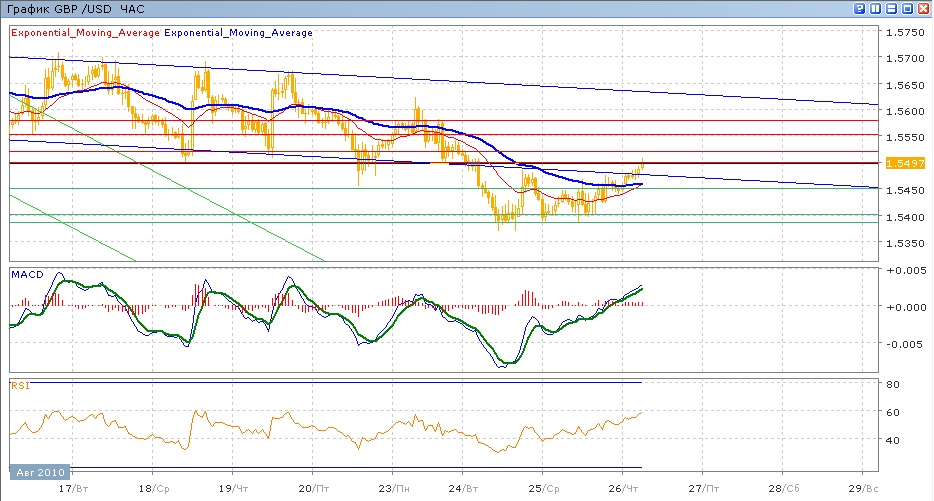 пара во вторник вышла вниз из нисходящего канала, в котором она двигалась с 12 августа, и протестировала уровень 1.5400. вчерашний торговый день также прошел в многократных попытках тестирования этого уровня, но безуспешно.в итоге к концу среды пара начала расти, что и продолжает делать сегодня, пытаясь преодолеть уровень 1.5500. Средние скользящие ЕМА21 и ЕМА55 готовы пересечся вверх, индикаторы MACD и RSI пересекли свои центральные лини вчера и продолжают расти. Цели на сегодня вверх — преодоление 1.5500 с последующим продвижением к 1.5550 и 1.5580. Движение вниз будет направлено на 1.5450 (с поддержкой от ЕМА21, ЕМА55 и нижней границы нисходящего канала), затем снижение к 1.5400.