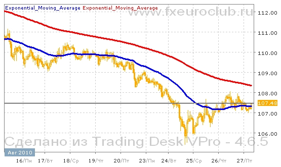 Валютная пара eur/jpy находится в состоянии падающего тренда. Но сейчас котировки отскочили от а минимальных уровней в районе 105,50 и закрепились в районе 107,50. На часовых графиках образовался уровень поддержки в районе 107,00, от которого котировки уже один раз отталкивались вверх. Если в этот раз уровень будет пробит вниз, то падение может ускориться. При этом поведение технических индикаторов в данный момент больше говорит о продолжении нисходящего тренда. Поскольку быстрая скользящая средняя с периодом 55 находится ниже медленной скользящей средней с периодом 200. При этом быстрая средняя движется наклонно вниз и параллельно медленной средней средней. Поэтому в данной ситуации продолжение падения становится делом времени. Целью снижения является уровень 103,00.