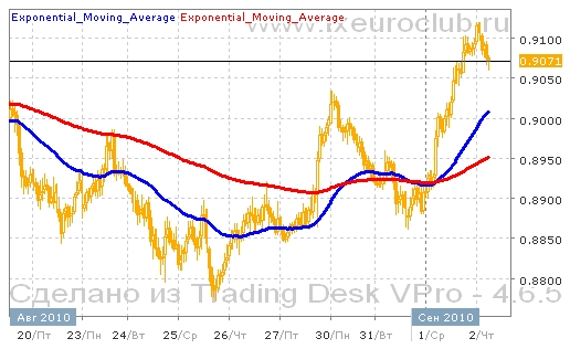 Валютная пара aud/usd к настоящему моменту находится в верхней части торгового диапазона за последние недели. Сейчас начинают формироваться предпосылки к продолжению восходящего тренда. В настоящее время тестируется вверх важный уровень сопротивления в районе 0,9100. Если этот уровень устоит, то дальнейшей целью движения может стать падение в район 0,8700. Согласно расположению скользящих средних сейчас началась восходящая фаза движения котировок. Поскольку быстрая скользящая средняя с периодом 55 пересекла вверх медленную с периодом 200. Но для продолжения роста необходимо удержаться выше уровня 0,9000.