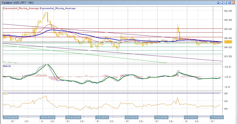 Снижение пары приостановилось. В общем, с 24 августа пара многократно тестировала вниз отметку 84.00, но безрезультатно, закрепиться ниже этого уровня у праы не получается. В пятницу наблюдалась попытка роста к 85.00, которая была сразу же отыграна вниз к 84.40. в понедельник пара торговалась в узком диапазоне с поддержкой на 84.20, вокруг которой она торгуется и входе сегодняшних торгов. Средние скользящие ЕМА21 и ЕМА55 замедлили снижение, индикаторы MACD и RSI сейчас наодятся под своими центральными линиями. Цели вверх на сегодня — это рост к отметке 84.55, далее 84.80 и 85.00. Цели вниз — преодоление 84.20, далее 84.00, затем повторение минимума среды на 83.67.