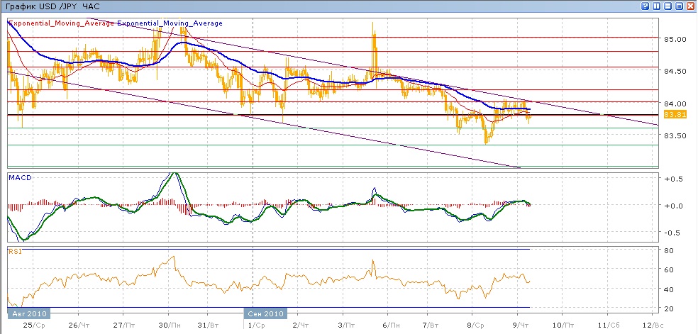 Снижение пары продолжилось во вторник и среду. Пара сумела все-таки преодолеть поддержку на уровне 84.00, в результате чего обновила свой минимум, добравшись до отметки 83.33 (минимальное с июня 1995 года значение). Последовавший рост к 84.00 выше не продвинулся. С начала сегодняшних торгов пара вновь показывает снижение. Средние скользящие ЕМА21 и ЕМА55 снова замедлили снижение, индикаторы MACD и RSI сейчас готовятся пересечь вниз свои центральные линии. Цели вверх на сегодня — это рост к отметке 83.80, далее 84.00 и 84.20. Цели вниз — преодоление 83.60, затем повторение вчерашнего минимума на 83.33, затем движение к 83.00..
