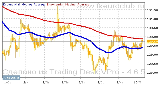 Валютная пара gbp/jpy продолжает колебаться на достигнутых ранее уровнях, хотя появляется все больше признаков прекращения нисходящего тренда. После достижения минимума в районе 127,80 цены отскочили вверх на уровень 130,20. Но дальнейшего движения вверх не последовало и котировки продолжили колебания на достигнутых ранее уровнях. В данный момент цены консолидируются примерно в верхней части диапазона вблизи отметки 129,60. При этом продолжение тренда будет выяснено после выхода котировок за пределы сложившегося диапазона колебаний 130,20-127,80. Комбинация скользящих средних с периодами 55 и 200 сейчас находится в положении нисходящего тренда, поскольку быстрая линия находится все еще ниже медленной. Но обе средние сейчас прекратили снижаться, поэтому не исключено, что понижение котировок может не состояться. Повышение котировок валютной пары gbp/jpy выглядит менее вероятным пока не пробит вверх уровень сопротивления в районе 130,20. В этом случае будет пробит нисходящий тренд.