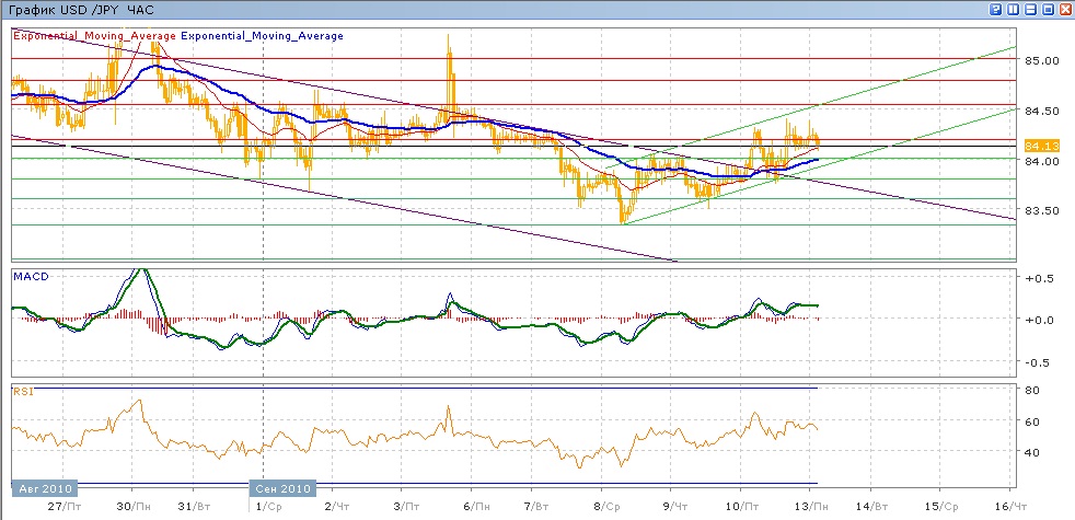С прошлой среды (после очередного минимума) пара постепенно растет, двигаясь в образовавшемся канале. Конец торгов пятницы пара встретила выше отметки 84.00. с начала сегодняшних торгов пара немного снижается, нацелившись, видимо, на отметку 84.00. Средние скользящие ЕМА21 и ЕМА55 направлены вверх, индикаторы MACD и RSI сейчас находятся выше своих центральных линий и снижаются. Цели вверх на сегодня — это рост к отметке 84,20, далее 84.40 (максимум пятницы) и 84.55. Цели вниз — преодоление 84.00, затем 83.80, 83.60, затем движение к минимумау прошлйо среды на 83.33.