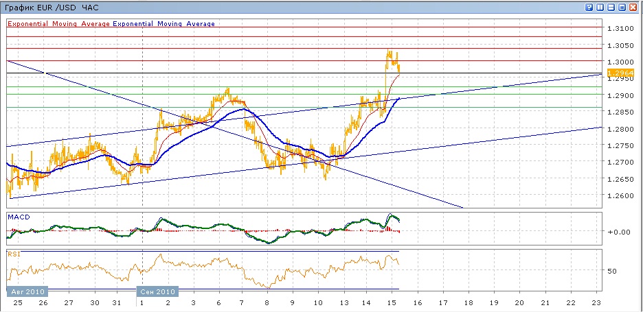 с прошлой пятницы пара увернно растет, прибавляя в среднем по более чем 100 пунктов роста в день. Вчера пара преодолела в течение торгов уровни 1.2900 и 1.3000, показав максимум сессии на 1.3035. После этого началось снижение, продолжающееся и сегодня.Средние скользящие ЕМА55 и ЕМА21 уверенно растут, индикаторы MACD и RSI сейчас находятся выше своих центральных линий и при этом снижаются. Целями вверх на сегодня станут возврат выше 1.3000 с возможнстью обновления вчерашнего максимума на 1.3035. Движение вниз будет проверять на прочность уровень 1.2920 и затем 1.2900.