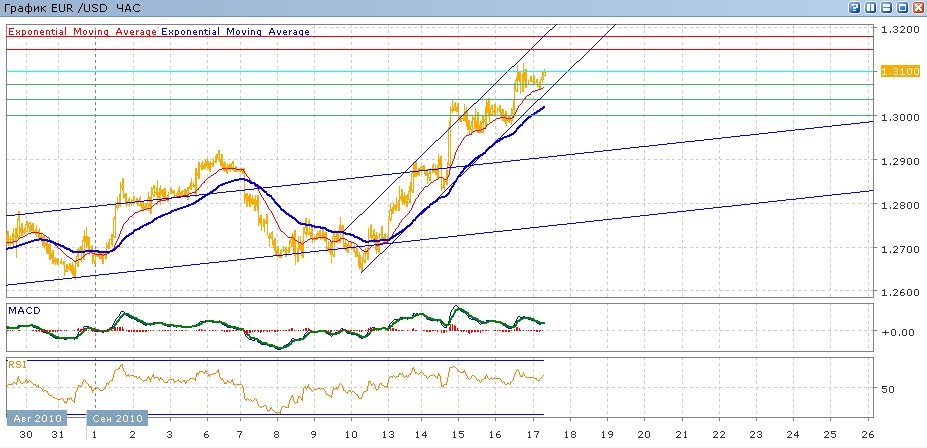 Пара уже неделю продолжает двигатсья вверх в резко восходящем канале. Итогом торгов в среду и четверг стало преодоление отметки 1.3000 и продвижение к уровню 1.3100, который вчера пара не смогла преодолеть и на котороый она сегодня вновь нацелилась. Средние скользящие ЕМА55 и ЕМА21 более чем уверенно растут, индикаторы MACD и RSI сейчас находятся выше своих центральных линий и при этом снижаются. Целями вверх на сегодня станут тестирование 1.3100 с возможнстью продвижения к 1.3150 и 1.3180. Движение вниз будет проверять на прочность уровень 1.3070, 1.3035 и затем 1.3000.