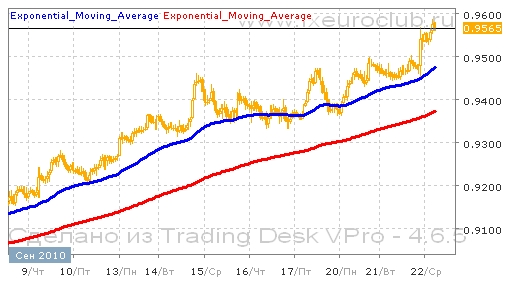 Валютная пара aud/usd в последнее время находится в состоянии восходящего тренда. Движение вверх продолжается и в данный момент котировки штурмуют вверх уровень 0,9570. Если удастся закрепиться выше уровня 0,9600, то следующей целью роста будет уровень 0,9800. При этом поведение скользящих средних сейчас говорит не в пользу понижения котировок. В настоящее время быстрая скользящая средняя находится над медленной, и обе пока движутся вверх. Поэтому скорее всего продолжится восходящее движение в рамках растущего тренда. Если не удастся пройти вверх уровень 0,9600, то возможен небольшой отскок вниз до уровня 0,9500.