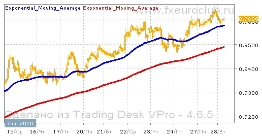 Валютная пара aud/usd в последнее время находится в состоянии восходящего тренда. Движение вверх продолжается и в данный момент котировки штурмуют вверх уровень 0,9640. Если удастся закрепиться выше уровня 0,9600, то следующей целью роста будет уровень 0,9800. При этом поведение скользящих средних сейчас говорит не в пользу понижения котировок. В настоящее время быстрая скользящая средняя находится над медленной, и обе пока движутся вверх. Поэтому скорее всего продолжится восходящее движение в рамках растущего тренда. Если не удастся пройти вверх уровень 0,9700, то возможен небольшой отскок вниз до уровня 0,9500.