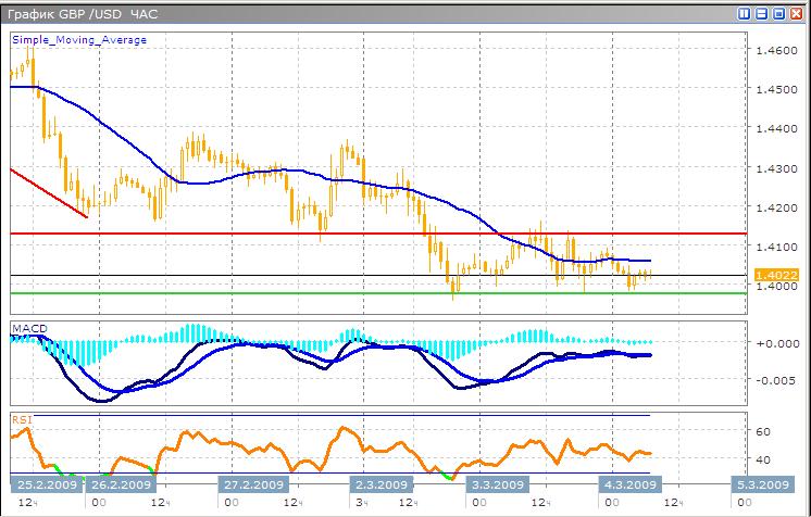 Совершенно очевидно, что пара находится по давлением, при этом с течением времени, потенциал снижения будет только нарастать. В настоящий момент цена колеблется в среднем по ширине ценовом диапазоне, у отметки 1.40, которая ранее уже играла определенные роли в динамике пары. Поскольку последние два дня пара торгуется в боковом тренде с малой амплитудой, технические индикаторы в данном случае мало эффективны. Гистограмма MACD слабо изменяется, и приближается с течение времени все ближе к нулевой оси, в то время как график индикатора RSI находится у средней линии, не давая тем самым никаких сигналов. Поскольку долгосрочные перспективы пары являются нисходящими, будем искать вход в рынок на продажу. В ситуациях, когда пара торгуется в боковом тренде со средней амплитудой, рекомендуется переходить на более мелкие временные периоды ценового графика и следуя дивергентным сигналам входить в рынок от линии канала в сторону глобального тренда.